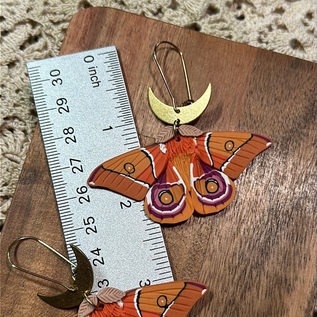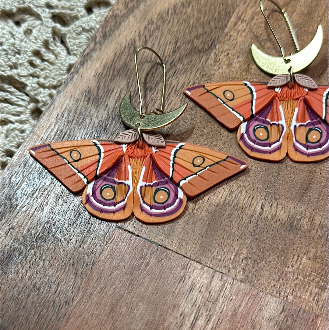 madagascar bullseye moth dangles hang from brass moon and stainless steel gold coated kidney wires.